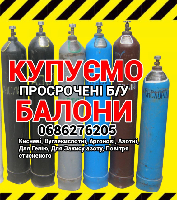купимо балони кисневі, вуглекислотні, аргонові, азотні, з під закису азоту, водневі, з під гелію, ємністю 2, 5, 8, 10, 12, 20, 40 літрів б / у в необмежених кількостях. Розглянемо всі варіанти.